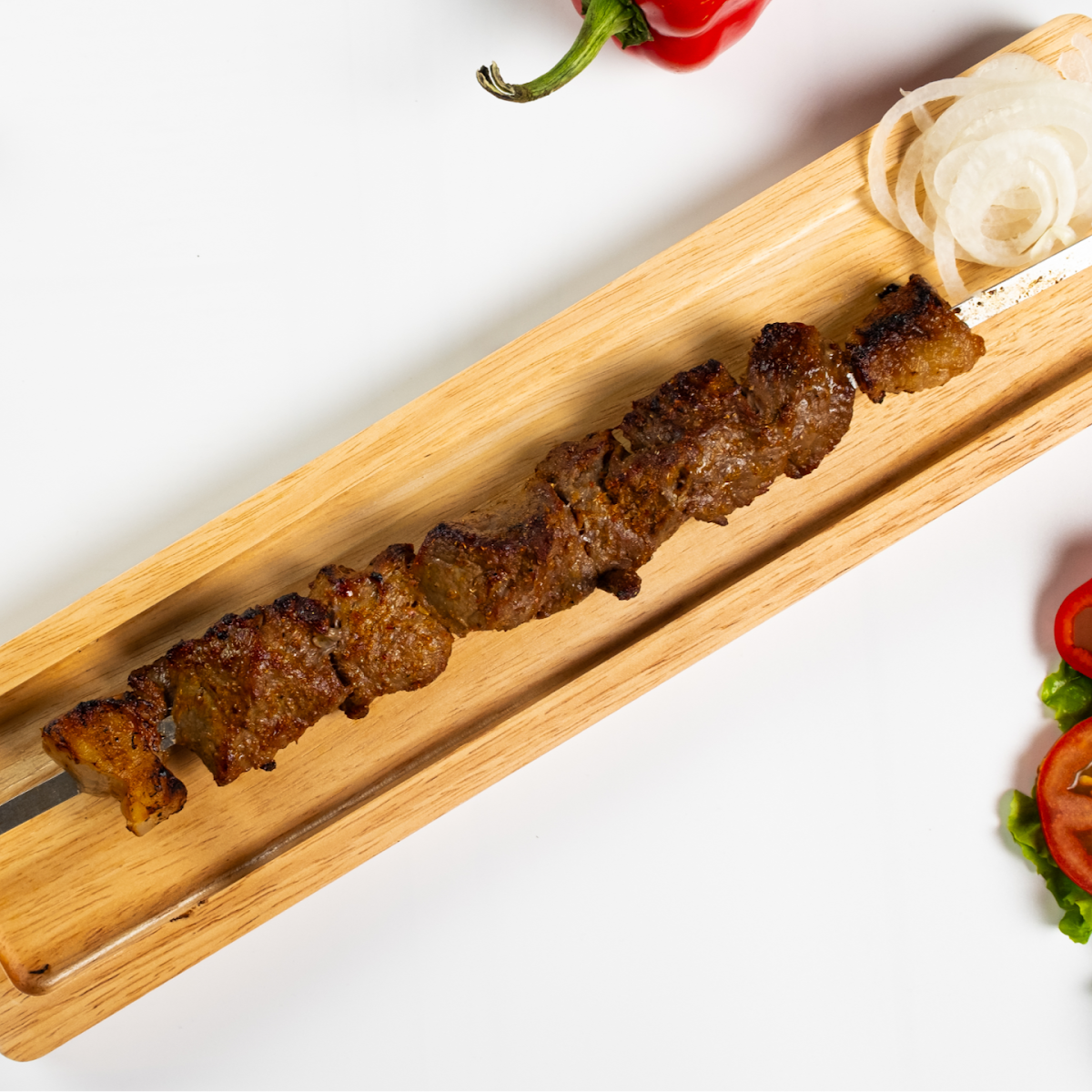 Фирменный шашлык ,мякоть говядины, курдюк, специи, сладкий перец, помидор